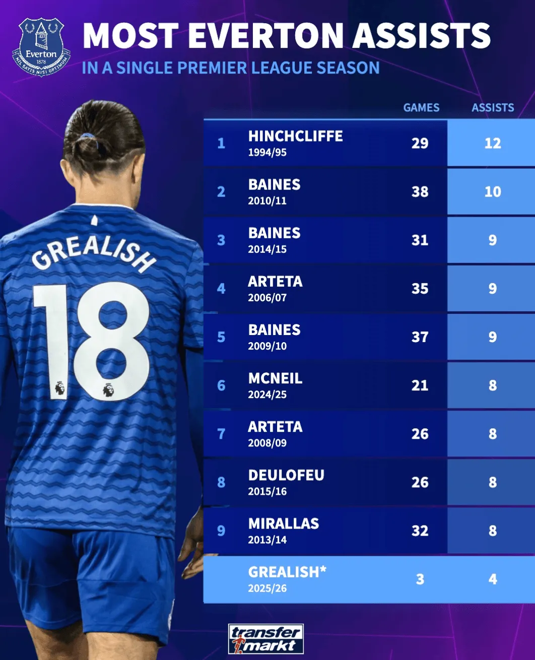 埃弗顿单赛季助攻王榜:塔帅占两席;格拉利什有望冲击纪录